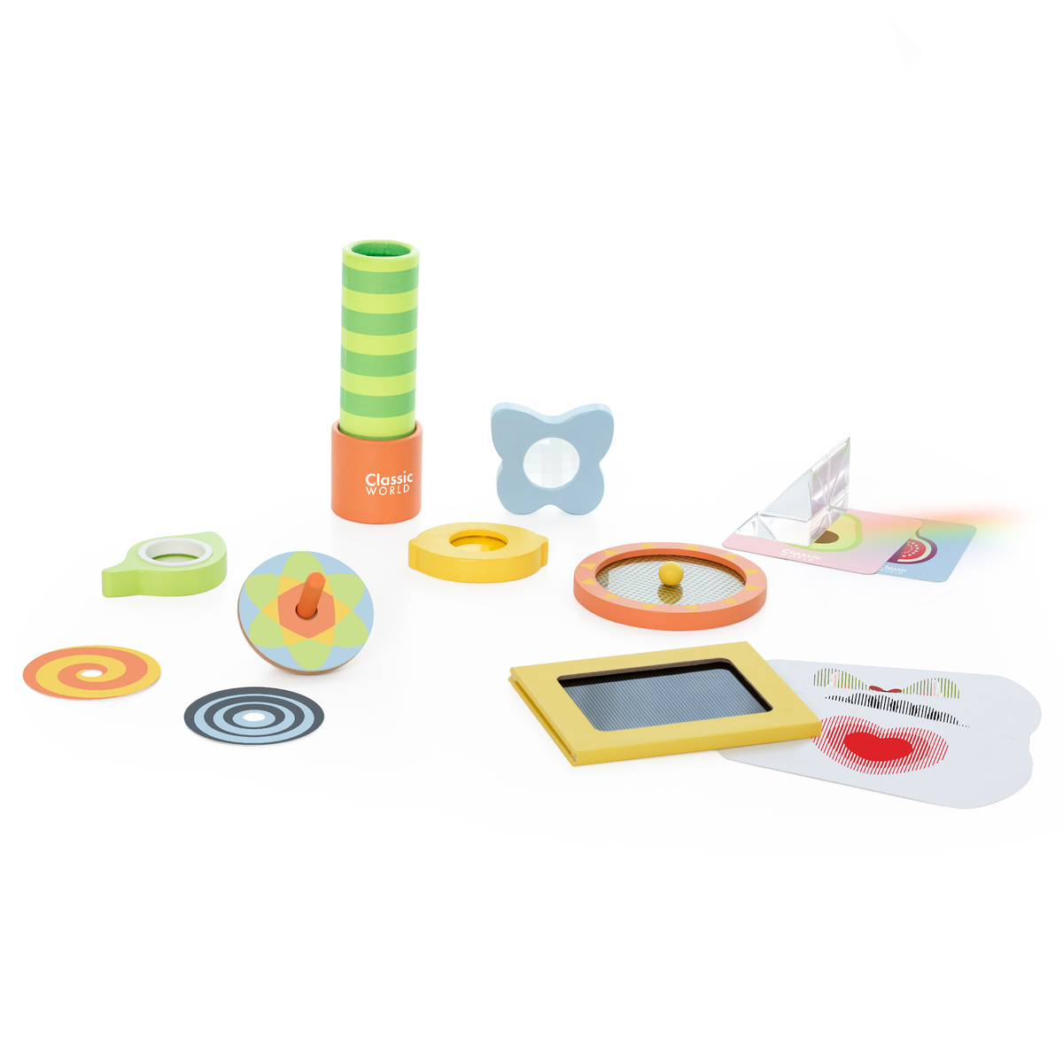 Το σετ οπτικής εξερεύνησης προσφέρει μια απολαυστική και εκπαιδευτική εμπειρία μέσα από διασκεδαστικά οπτικά εργαλεία, όπως καλειδοσκόπιο, κουτί διάθλασης και περιστρεφόμενο δίσκο. Ενθαρρύνει την εξερεύνηση, τη δημιουργικότητα και τη μάθηση μέσω πράξης, καθιστώντας το ένα πολύτιμο εργαλείο για μικρούς επιστήμονες και μαθητές. Τα παιδιά ανακαλύπτουν τις βασικές αρχές της οπτικής με τρόπο διαδραστικό, καλλιεργώντας τη φαντασία και την αγάπη για την επιστήμη. Ένα παιχνίδι που συνδυάζει την ομορφιά με την επιστημονική αναζήτηση — ταυτόχρονα εντυπωσιακό και ουσιαστικά εκπαιδευτικό!