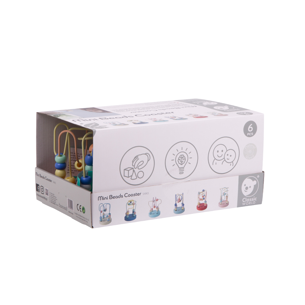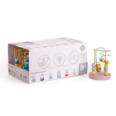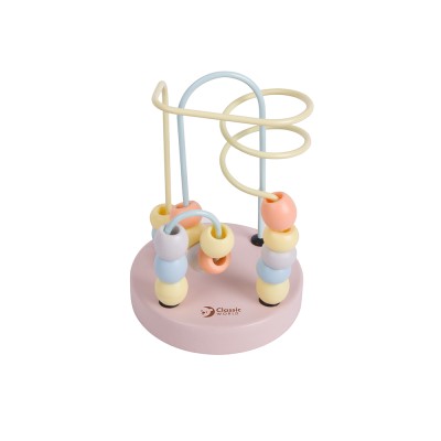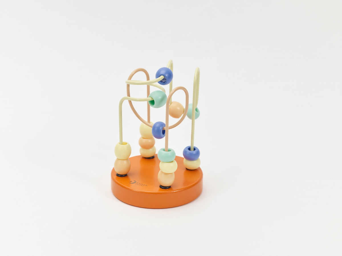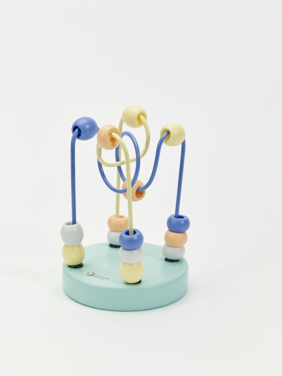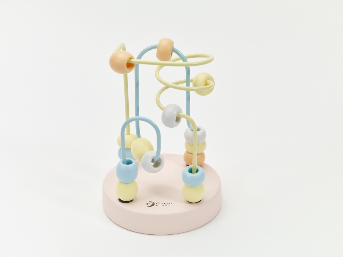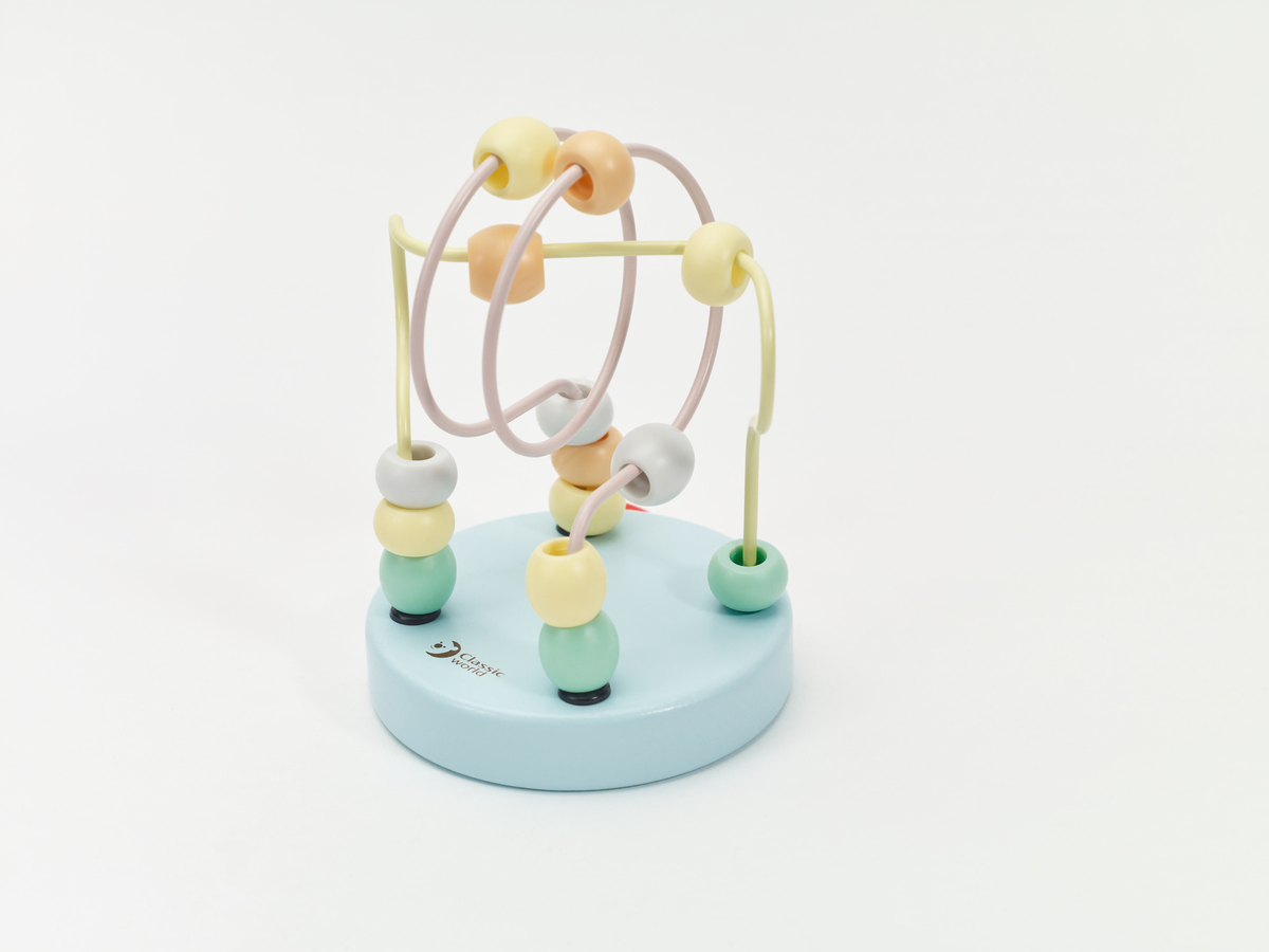Το παιχνίδι αποτελείται από μια ξύλινη βάση όπου είναι στερεωμένα εύκαμπτα πλαστικά καλώδια με διαφορετικά χρώματα. Τα καλώδια μπλέκονται μεταξύ τους ώστε να δημιουργήσουν το καθένα τη διαδρομή ενός μικρού λαβύρινθου. Σε αυτές τις διαδρομές είναι τοποθετημένες πολύχρωμες ξύλινες χάντρες που μπορούν να μετακινούνται σε όλη τη διαδρομή του λαβύρινθου. Ο ξύλινος λαβύρινθος με πολύχρωμες ξύλινες χάντρες προσφέρει ώρες διασκέδασης στους μικρούς μας φίλους. Μέσα από το παιχνίδι, το παιδί μαθαίνει τα χρώματα και να μετράει, βελτιώνει τον συντονισμό ματιού και χεριού, ενώ παράλληλα αναπτύσσει τις λεπτές κινητικές δεξιότητες του καρπού.