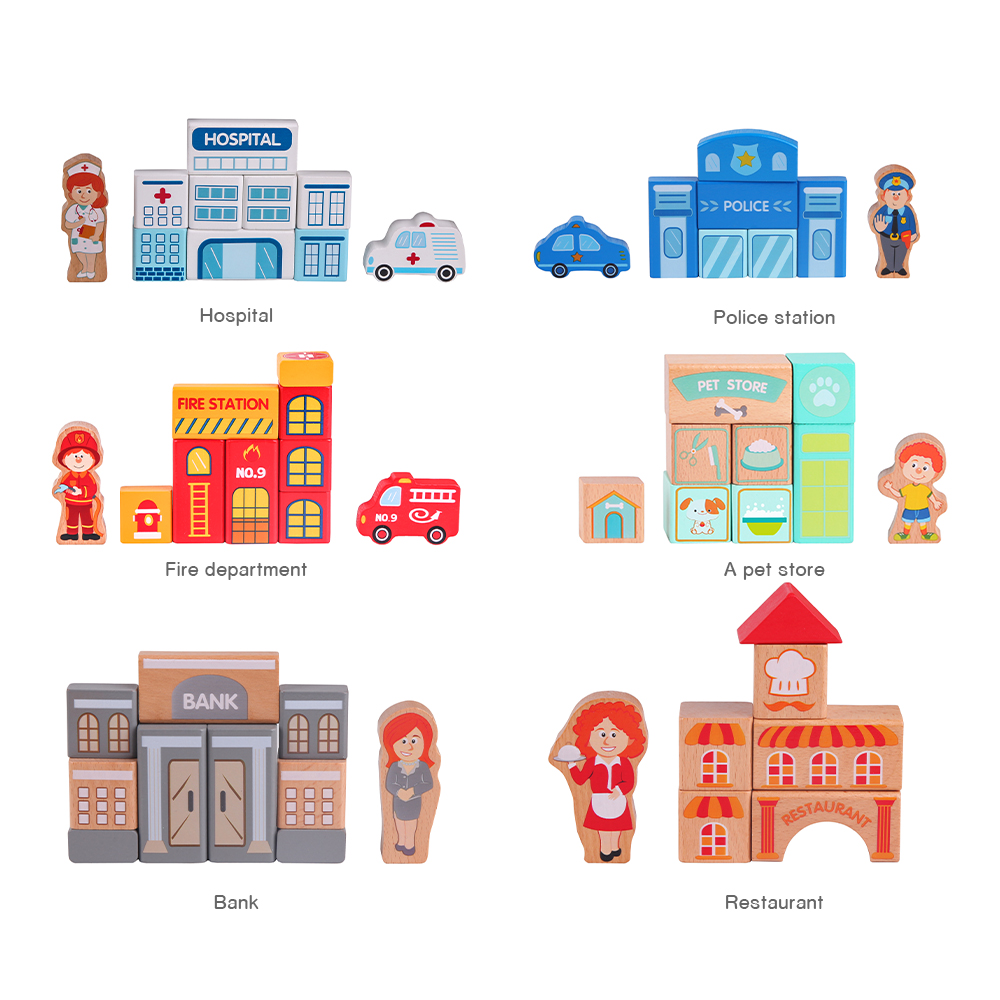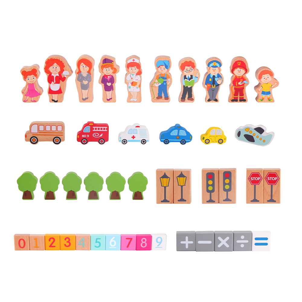 Αφήστε τα παιδιά σας να δημιουργήσουν τη δική τους πόλη με αυτό το υπέροχο σετ! Περιλαμβάνει 20 κομμάτια παζλ για τη βάση της πόλης και 100 ξύλινα τουβλάκια με σχέδια από κτίρια, φιγούρες ανθρώπων, γράμματα, αριθμούς και μαθηματικά σύμβολα.