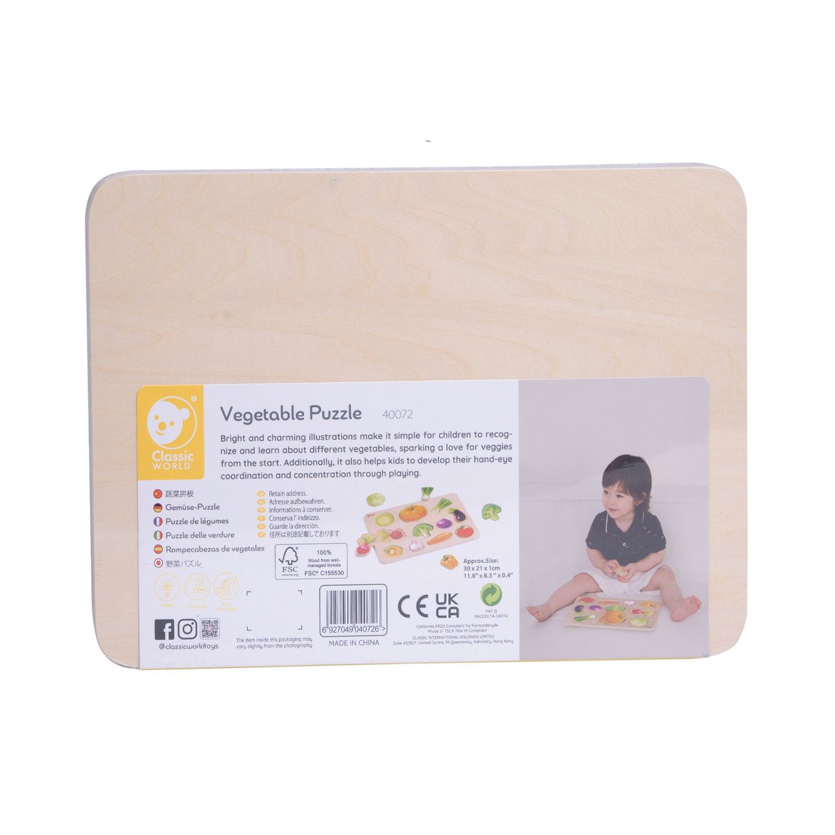 Σε αυτό το ξύλινο παζλ σφηνώματα, φωτεινές και χαριτωμένες εικονογραφήσεις βοηθούν τα παιδιά να αναγνωρίσουν και να μάθουν για διαφορετικά λαχανικά, ενθαρρύνοντάς τα να αγαπήσουν τα λαχανικά από νωρίς. Παράλληλα, ενισχύουν τον συντονισμό χεριού-ματιού και τη συγκέντρωσή τους μέσα από το παιχνίδι.