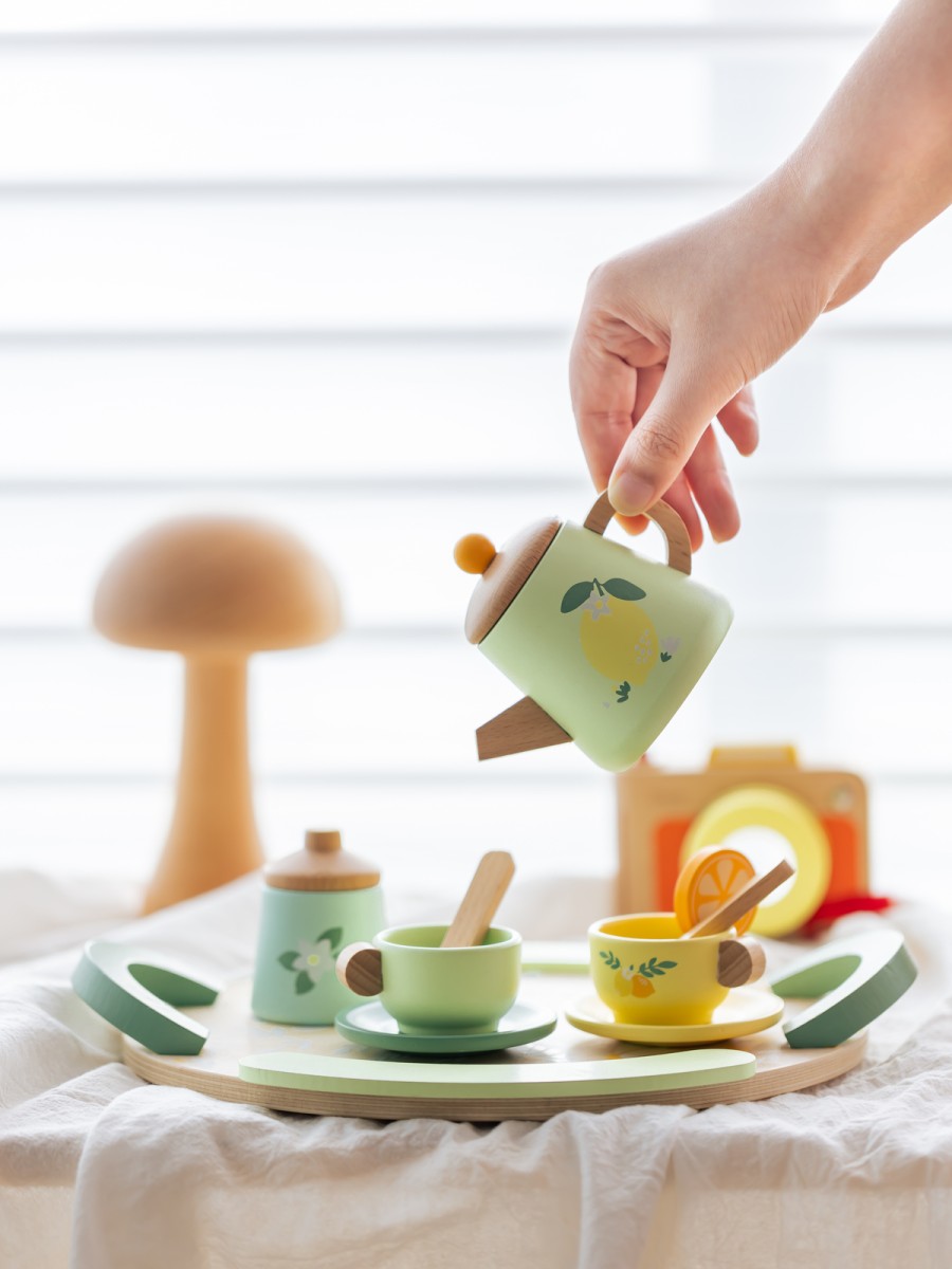 Το ξύλινο σετ τσαγιού περιλαμβάνει δύο φλιτζάνια με πιατάκια, μια τσαγιέρα, δύο γεύσεις τσαγιού, κουταλάκι, δίσκο και άλλα αξεσουάρ. Μετατρέψτε το τσάι σε μια υπέροχη τελετουργία και καλέστε τους φίλους σας σε ένα απολαυστικό πάρτι τσαγιού! Μέσα από το παιχνίδι, τα παιδιά αναπτύσσουν τη φαντασία τους και ενισχύουν τις κοινωνικές τους δεξιότητες.