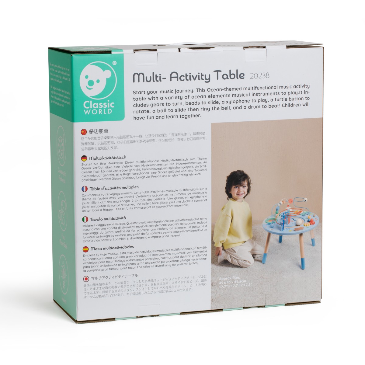 Ξεκινήστε το μουσικό ταξίδι του μικρού σας με αυτό το Ξύλινο Τραπέζι Πολλαπλών Δραστηριοτήτων με θέμα τον ωκεανό! Συνδυάζει ποικιλία οργάνων και διαδραστικών στοιχείων: γρανάζια για να γυρίζουν, χάντρες για να γλιστρούν, ξυλόφωνο για να παίζουν μουσική, κουμπί-χελώνα για περιστροφή, μπάλα που γλιστρά και χτυπάει καμπανάκι, καθώς και ντραμς για χτύπημα! Τα παιδιά διασκεδάζουν, εξερευνούν τον κόσμο της μουσικής και μαθαίνουν παίζοντας.