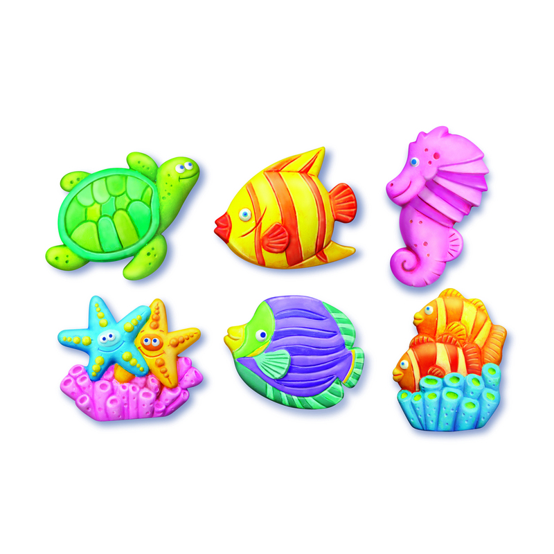 ΠΑΡΑΣΚΕΥΗ: Προετοίμασε το μείγμα του γύψου, ακολουθώντας πιστά τις οδηγίες όπως αναγράφονται στη συσκευασία. Ρίξε το μείγμα του γύψου στα καλούπια και ανακίνηδε τα ελαφρά. Άφησε τον γύψο να στερεοποιηθεί για λίγη ώρα και ζωγράφισε τις θαλάσσιες φιγούρες με τα χρώματα που περιλαμβάνονται.