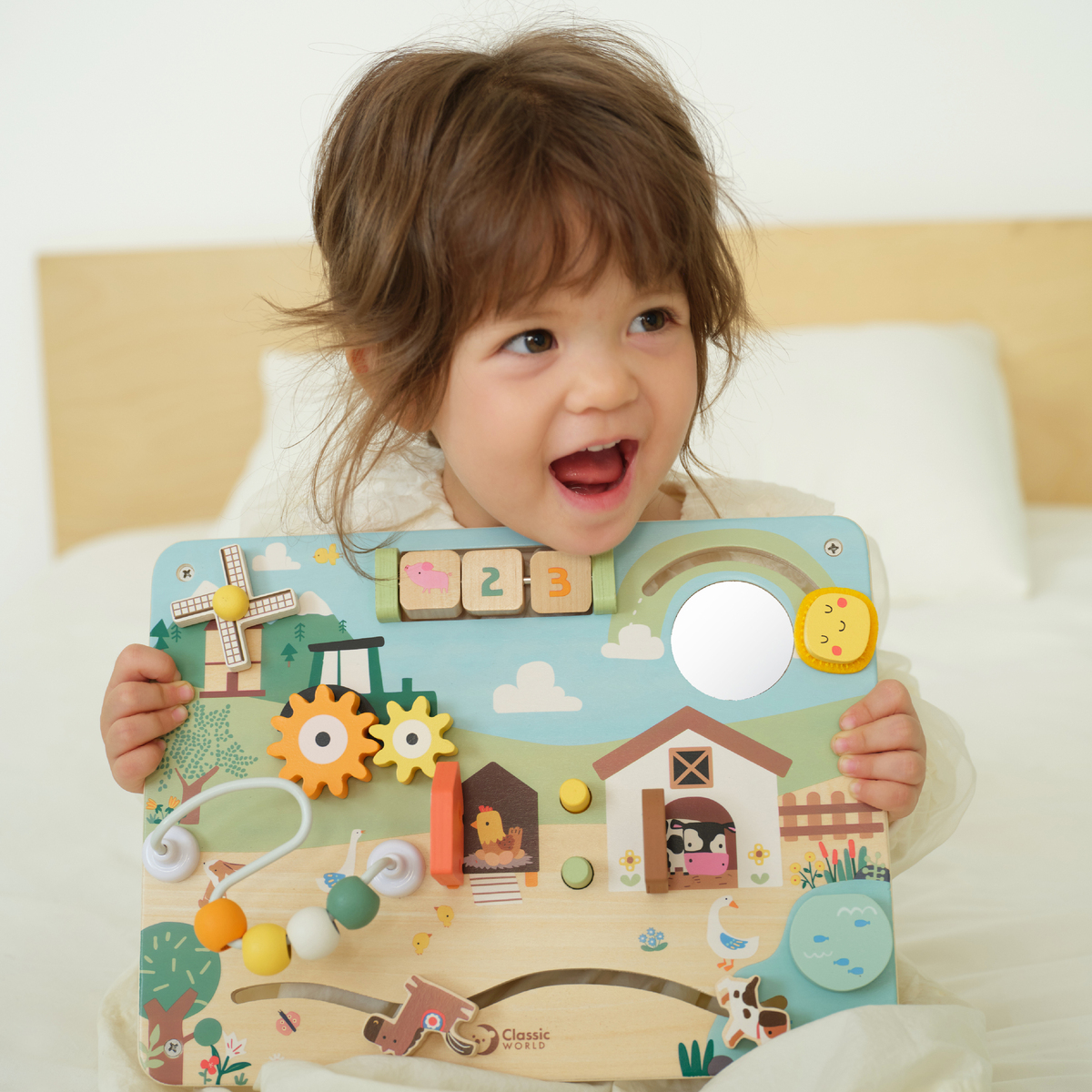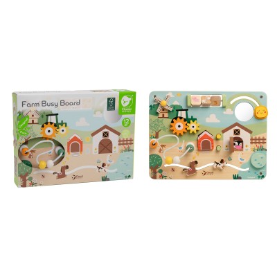 Ας ανακαλύψουμε τα μυστικά της φάρμας! Αυτός ο Ξύλινος Πίνακας Δραστηριοτήτων με θέμα τη φάρμα είναι ειδικά σχεδιασμένος για νήπια και περιλαμβάνει λαβύρινθους με χάντρες, ζωάκια της φάρμας πίσω από κρυφές πόρτες, ανεμόμυλο και πολλά ακόμα. Οι διαδραστικές δραστηριότητες και η αισθητηριακή διέγερση βοηθούν στην ανάπτυξη πρώιμων γνωστικών δεξιοτήτων και της λεπτής κινητικότητας, προσφέροντας ταυτόχρονα ώρες δημιουργικού παιχνιδιού.